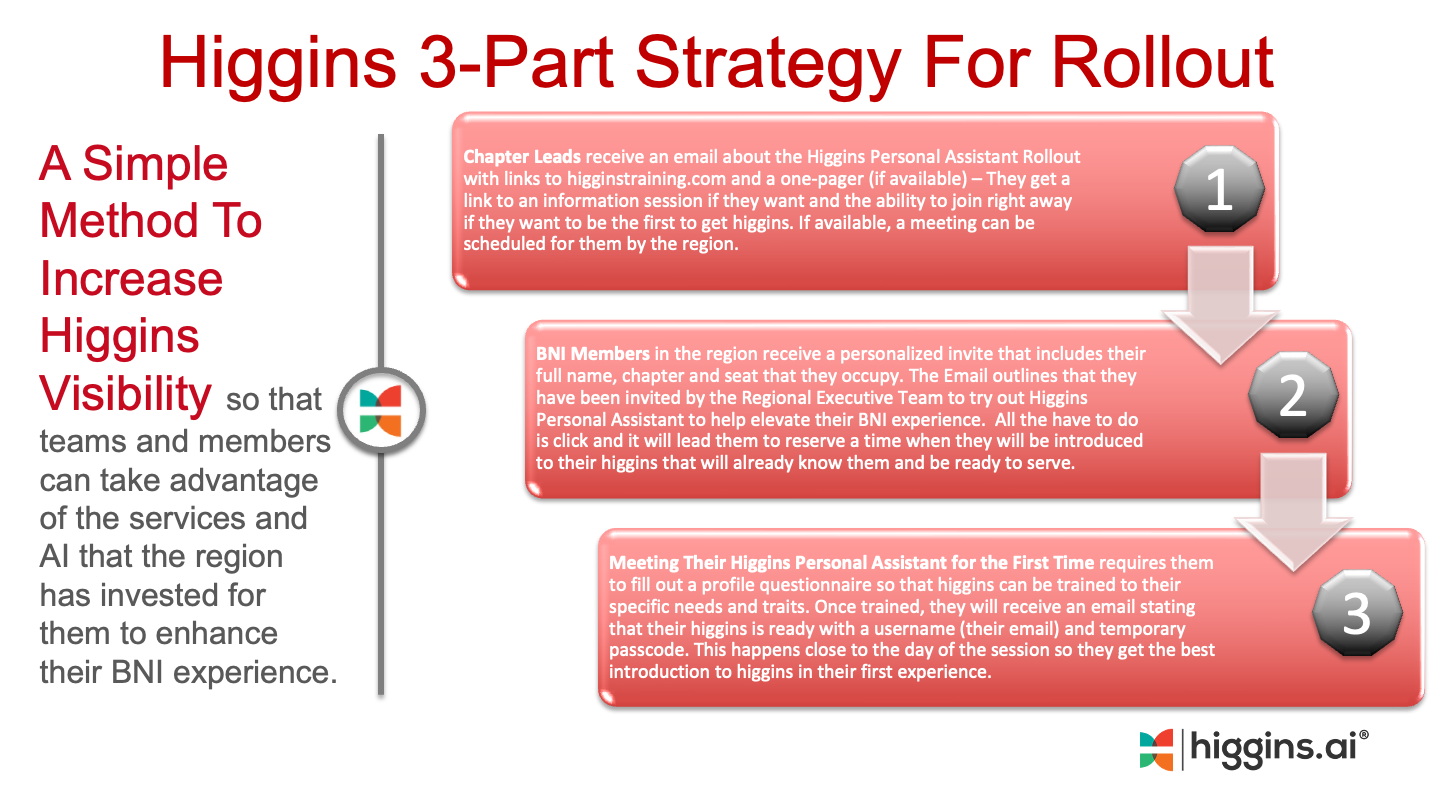 This is a roadmap for higgins training rollout throughout the regions to get more members to use AI in their everyday BNI activities.